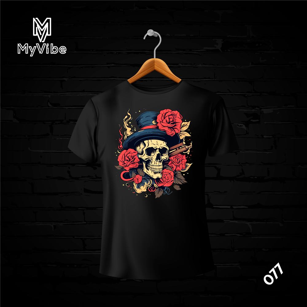 SKU: 077 Category:T-shirt Tags:hat, head, red, roses, scary, skeleton, skull